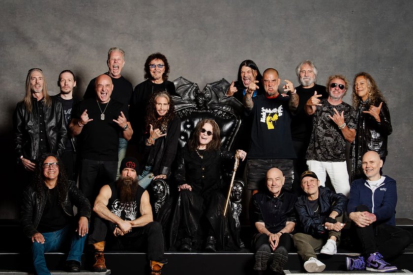 Fileira superior (da esquerda para a direita): Rex Brown; Tobias Forge; David Draiman; James Hetfield; Tony Iommi; Robert Trujillo; Phil Anselmo; Geezer Butler; Sammy Hagar; Kirk Hammett. No meio: Steven Tyler; Ozzy Osbourne. Fileira inferior (da esquerda para a direita): Mike Inez; Zakk Wylde; Bill Ward; Lars Ulrich; Billy Corgan. Fotografia: Black Sabbath/Ross Halfin